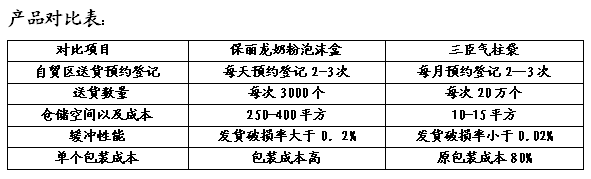 包装方案改进后,我们从人力成本、仓储费用、奶粉破损率、包装成本上,节约费用20%以上。提高了包装出货效率,客户投诉率由0.11%,降低到0.001%。