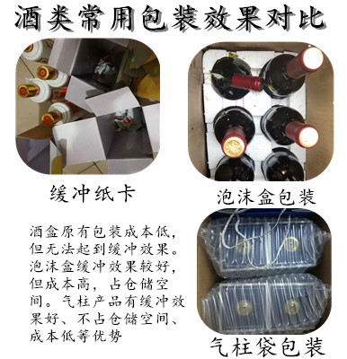 气柱袋可以采用自动充气设备充气,即充即用,包装效率高。气泡膜需要绕5--6层,并使用胶带打包,效率低。1分钟可以使用气柱袋打包10--15瓶,使用气泡膜只能打包3--5瓶红酒。
